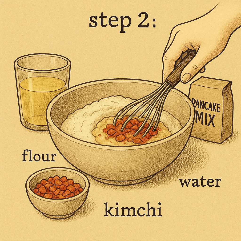볼에 김치, 부침가루, 김치국물, 물을 넣고 섞어. 반죽 농도는 ‘걸쭉하게 흐르는 정도’가 좋아. 너무 묽으면 전이 찢어지고, 너무 되면 퍽퍽해. 감으로 하자. 우리는 자유로운 영혼이니까.