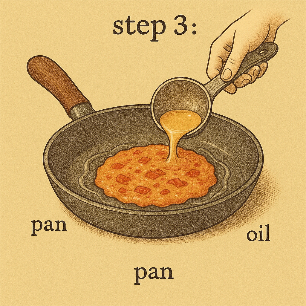 팬에 기름을 넉넉히 두르고 달궈! 반죽을 넣고 얇고 넓게 펴줘. 그래야 바삭함 폭발💥