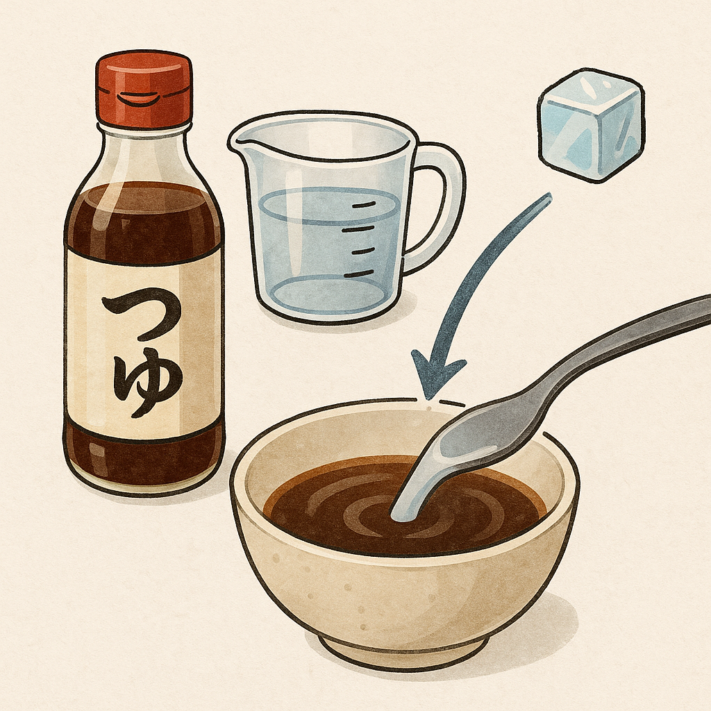 시판 쯔유와 물을 1:2 비율로 섞어줍니다. 더 시원하게 즐기고 싶다면 얼음을 추가하거나 냉장고에 미리 넣어 차갑게 식혀주세요.