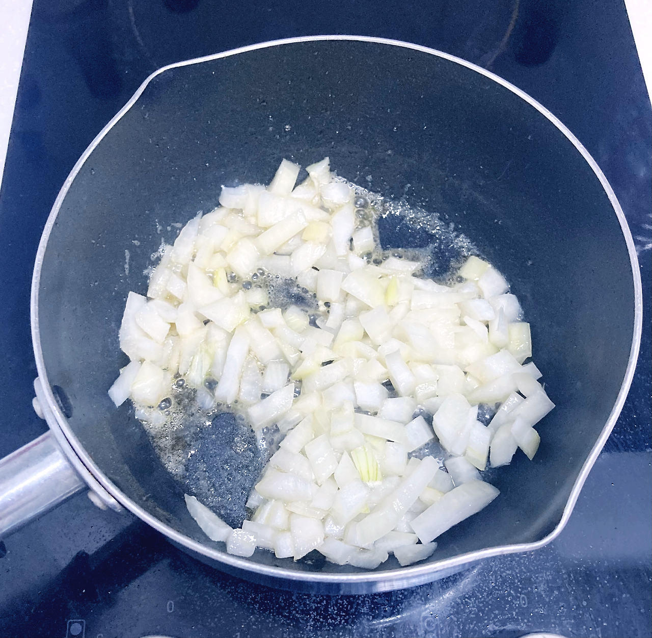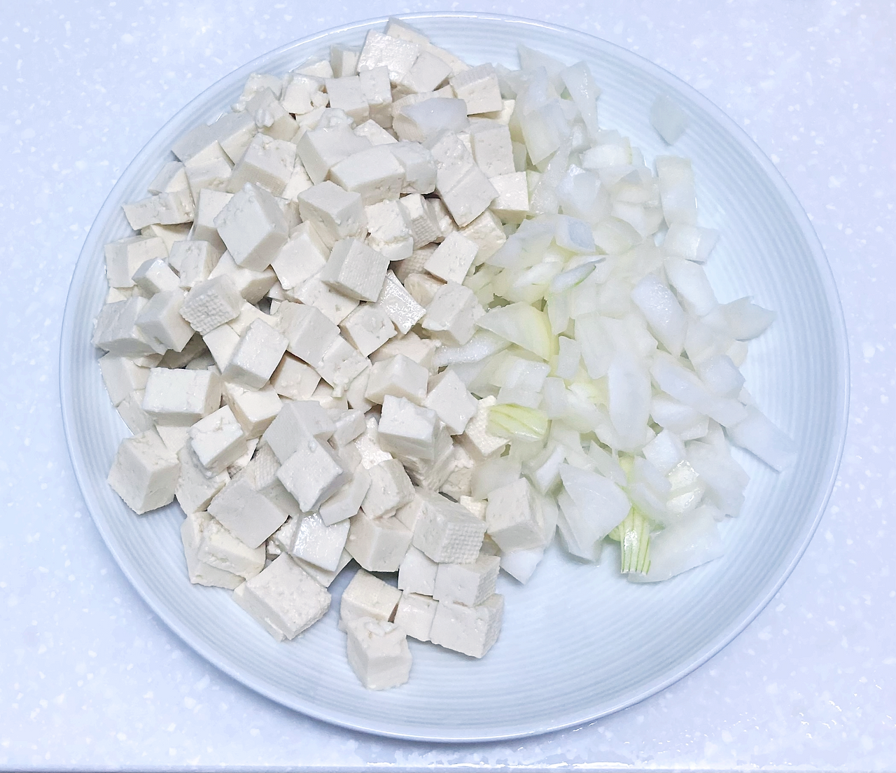 양파를 너무 작게 다지지 않고 씹는 맛이 있는 정도로 다져서 준비합니다. 두부도 양파와 비슷한 사이즈로 썰어서 재료를 준비합니다. 재료가 준비되면 먼저 기름 한 바퀴 두른 후 양파를 적당히 익을 정도로 볶아줍니다.