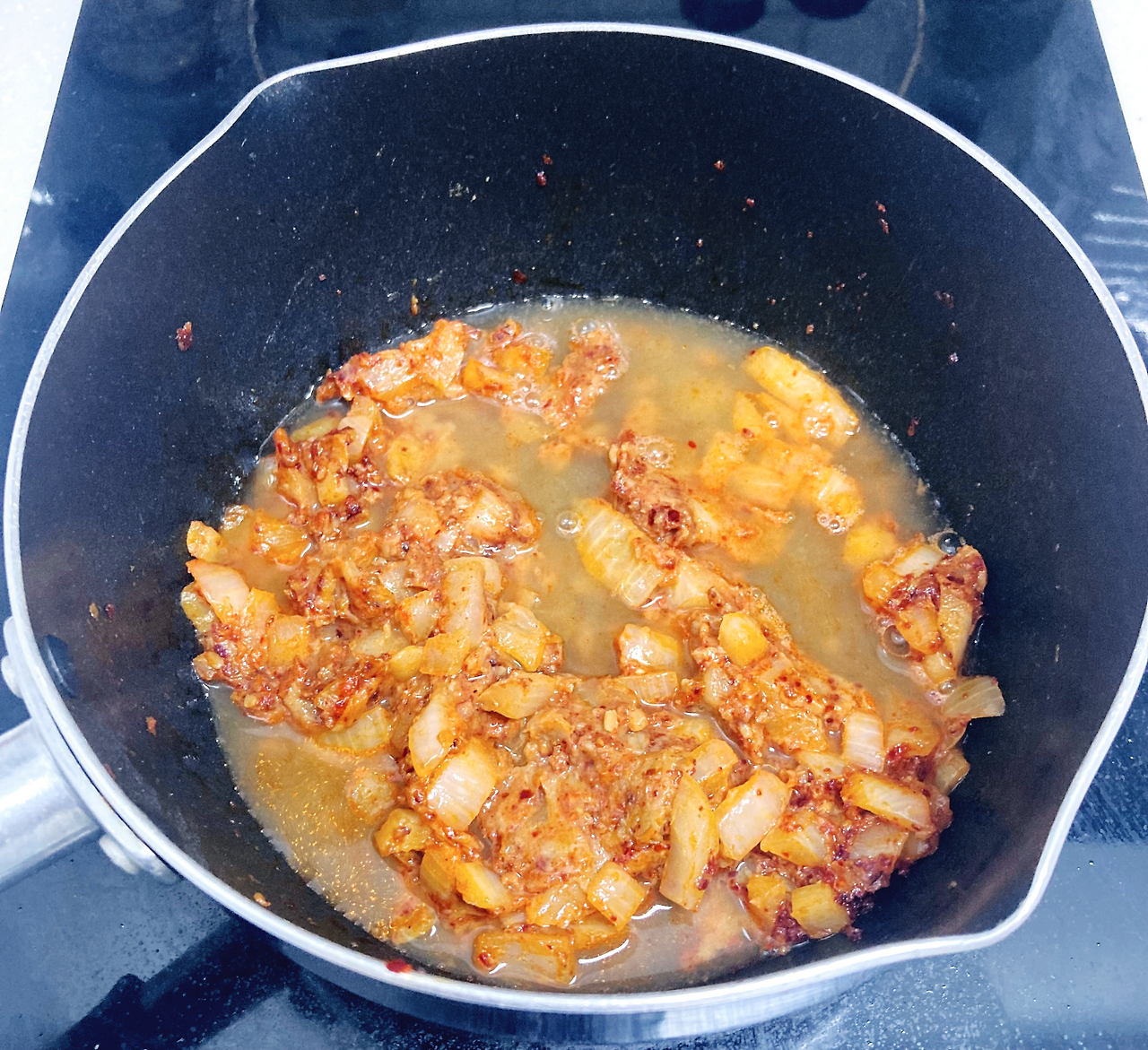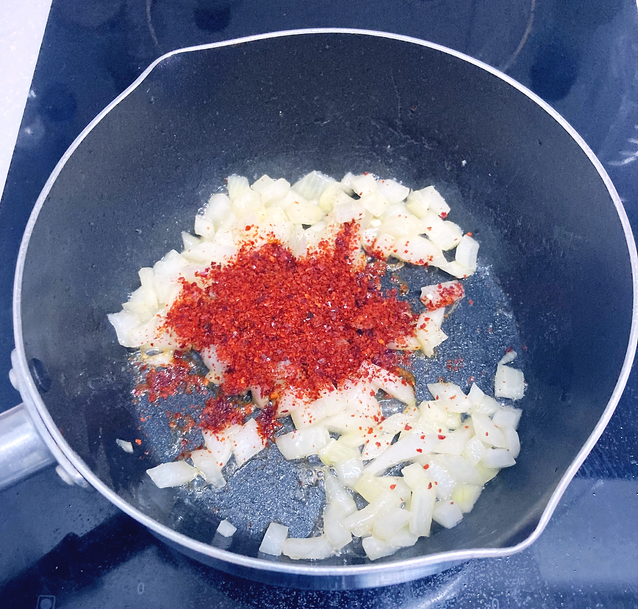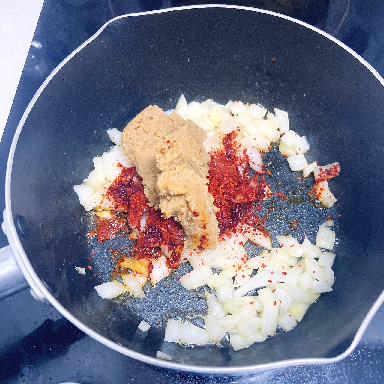 적당히 익은 양파에 준비된 고춧가루와 된장을 넣어 달달 볶아서 풍미를 이끌어 주도록 합니다. 여기서 팁을 드리면 흔히 말하는 '집된장'을 이용하면 훨씬 깊은 맛을 느낄 수 있습니다. 물론 집된장을 사용하시면 고추장을 조금 추가해서 볶아주시면 맛있는 강된장 베이스가 만들어질 겁니다. 저는 시중에 파는 된장을 이용해서 만들어서 추가적으로 고추장을 넣지는 않았습니다.