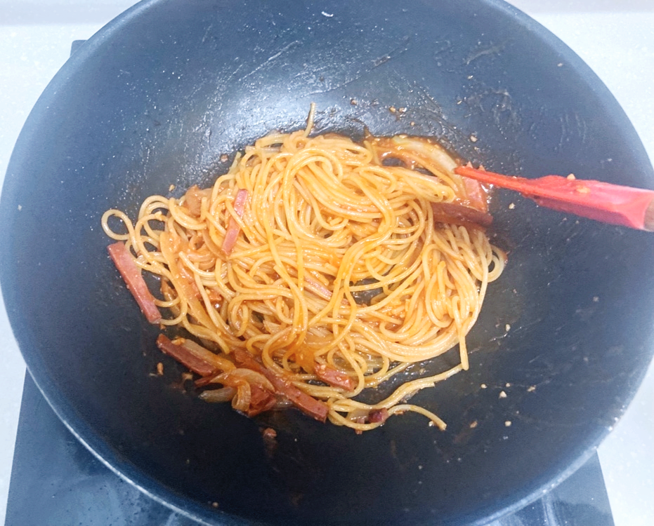 면을 열심히 삶는 동안 양파와 햄을 볶으면서 준비를 해두고 7분 후 면을 넣고 다시 볶아줄 준비를 합니다. 여기서 케첩 5~6T를 넣고 면수 100 ml를 넣고 볶아줍니다. 여기서 굴소스 1T 정도 넣어주시면 더 좋을 수 있으니 기호에 따라 넣어서 조리해 주시면 됩니다.